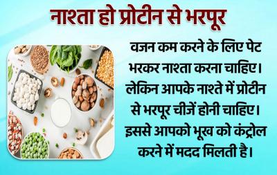 वजन कम करने के लिए पेट भरकर नाश्ता करना चाहिए। लेकिन आपके नाश्ते में प्रोटीन से भरपूर चीजें होनी चाहिए। इससे आपको भूख को कंट्रोल करने में मदद मिलती है।