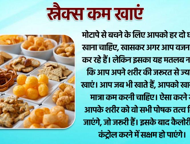 मोटापे से बचने के लिए आपको हर दो घंटे में खाना चाहिए, खासकर अगर आप वजन कम कर रहे हैं। लेकिन इसका यह मतलब नहीं है कि आप अपने शरीर की जरूरत से ज्यादा खाएं। आप जब भी खाते हैं, आपको खाने की मात्रा कम करनी चाहिए। ऐसा करने से आपके शरीर को वो सभी पोषक तत्व मिल जाएंगे, जो जरूरी हैं। इसके बाद कैलोरी को कंट्रोल करने में सक्षम हो पाएंगे।