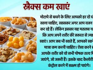 1 / 5मोटापे से बचने के लिए आपको हर दो घंटे में खाना चाहिए, खासकर अगर आप वजन कम कर रहे हैं। लेकिन इसका यह मतलब नहीं है कि आप अपने शरीर की जरूरत से ज्यादा खाएं। आप जब भी खाते हैं, आपको खाने की मात्रा कम करनी चाहिए। ऐसा करने से आपके शरीर को वो सभी पोषक तत्व मिल जाएंगे, जो जरूरी हैं। इसके बाद कैलोरी को कंट्रोल करने में सक्षम हो पाएंगे। 2 / 5जब कुछ चीज खाते हैं, तो आपको उस समय सिर्फ खाने पर ही ध्यान देना चाहिए। इस दौरान टीवी देखना या मोबाइल पर बात करने से आप देर तक और अधिक मात्रा में खा सकते हैं। इसके अलावा पेट दिमाग को यह सिग्नल नहीं भेज पाता है कि पेट भर गया है और आपको यह भी पता नहीं चलता कि आपने कितना खा लिया है। 3 / 5कई लोग जल्दी-जल्दी खाते हैं और खाने को अच्छी तरह चबाकर नहीं खाते हैं। इससे ना केवल खाने को पचाने में समस्या होती है बल्कि दिमाग को पेट भरने वाले मिलने वाले सिग्नल भी बाधित होते हैं। इसका परिणाम यह होता है कि आप ज्यादा खा लेते हैं।4 / 5एक्सपर्ट ऐसा मानते हैं कि तनाव में लोग ज्यादा खाते हैं। इसलिए आपको हमेशा दोस्तों और परिवार के साथ खाना चाहिए। इससे आपका ध्यान केवल खाने पर नहीं रहता है। जाहिर है ऐसे में आप ज्यादा खाने से बच सकते हैं। 5 / 5वजन कम करने के लिए पेट भरकर नाश्ता करना चाहिए। लेकिन आपके नाश्ते में प्रोटीन से भरपूर चीजें होनी चाहिए। इससे आपको भूख को कंट्रोल करने में मदद मिलती है।