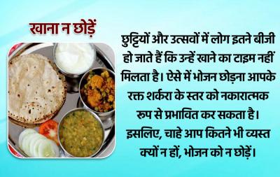 छुट्टियों और उत्सवों में लोग इतने बीजी हो जाते हैं कि उन्हें खाने का टाइम नहीं मिलता है। ऐसे में भोजन छोड़ना आपके रक्त शर्करा के स्तर को नकारात्मक रूप से प्रभावित कर सकता है। इसलिए, चाहे आप कितने भी व्यस्त क्यों न हों, भोजन को न छोड़ें।