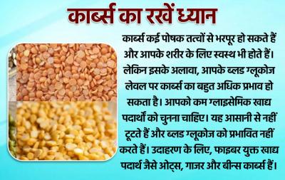 कार्ब्स कई पोषक तत्वों से भरपूर हो सकते हैं और आपके शरीर के लिए स्वस्थ भी होते हैं। लेकिन इसके अलावा, आपके ब्लड ग्लूकोज लेवल पर कार्ब्स का बहुत अधिक प्रभाव हो सकता है। आपको कम ग्लाइसेमिक खाद्य पदार्थों को चुनना चाहिए। यह आसानी से नहीं टूटते हैं और ब्लड ग्लूकोज को प्रभावित नहीं करते हैं। उदाहरण के लिए, फाइबर युक्त खाद्य पदार्थ जैसे ओट्स, गाजर और बीन्स कार्ब्स हैं।