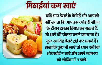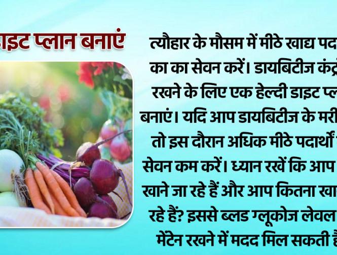 त्यौहार के मौसम में मीठे खाद्य पदार्थों का का सेवन करें। डायबिटीज कंट्रोल रखने के लिए एक हेल्दी डाइट प्लान बनाएं। यदि आप डायबिटीज के मरीज हैं, तो इस दौरान अधिक मीठे पदार्थों का सेवन कम करें। ध्यान रखें कि आप क्या खाने जा रहे हैं और आप कितना खाने जा रहे हैं? इससे ब्लड ग्लूकोज लेवल को मेंटेन रखने में मदद मिल सकती है।