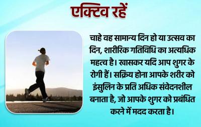 चाहे वह सामान्य दिन हो या उत्सव का दिन, शारीरिक गतिविधि का अत्यधिक महत्व है। खासकर यदि आप शुगर के रोगी हैं। सक्रिय होना आपके शरीर को इंसुलिन के प्रति अधिक संवेदनशील बनाता है, जो आपके शुगर को प्रबंधित करने में मदद करता है।