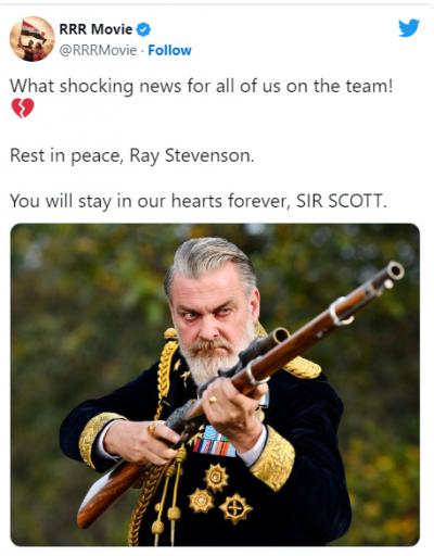 RRR टीम ने सोशल मीडिया पर लिखा, 'हम सभी के लिए चौंकाने वाली खबर है! रेस्ट इन पीस, रे स्टीवेन्सन। आप हमेशा हमारे दिलों में रहेंगे, सर स्कॉट।'