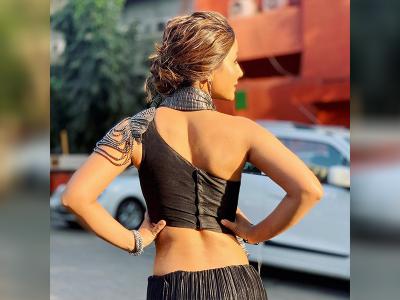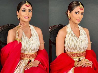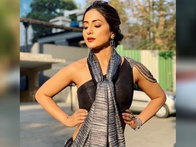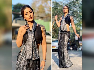 हिना ने साड़ी को काफी तरह से पहना हुआ है, उन्होंने साड़ी को स्कॉर्फ की तरह और उसके साथ वन साइड शोल्डर ब्लाउज पहना हुआ है।