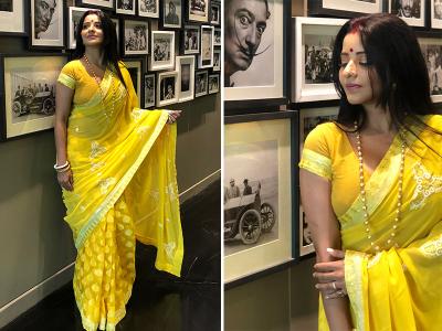 मोनालिसा का यह ग्लैमरस साड़ी लुक आपके मन को जरूर भा जाएगा।