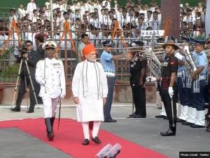 1 / 7भारत आज अपना 72वां स्वतंत्रता दिवस मना रहे हैं। इस मौके पर पूरे देश में जश्न-ए-आजादी का माहौल है। देश के अलग-अलग हिस्सों के साथ राजधानी दिल्ली में मुख्य जश्न मनाया जा रहा है। लालकिले पर मनाए जा रहे जश्न में देश के प्रधानमंत्री नरेंद्र मोदी को गॉर्ड ऑफ ऑनर दिया। इसके बाद पीएम मोदी ने तिरंगा झंडा फहराया।2 / 7प्रधानमंत्री नरेंद्र मोदी आज सफेद कुर्ता-पायजामा और केसरिया पगड़ी धारण किए हुए हैं। साल 2014 में भाजपा की अगुवाई में एनडीए के सत्ता में आने के बाद से यह उनका पांचवां संबोधन है। ऐसे में पूरे देश की निगाहे उनके इस कार्यकाल के अंतिम भाषण पर टिकी हुई हैं।3 / 7प्रधानमंत्री नरेंद्र मोदी ने लालकिले में तिरंगा झंडा लहराया। इसके बाद राष्ट्रगान गाया गया। इस मौके पर सत्ता और विपक्ष के कई गणमान्य नेता और स्कूली बच्चे मौजूद रहे। इसके बाद पीएम मोदी ने भाषण की शुरुआत की।4 / 7मेरे प्यारे देशवासियों! आज देश आत्मविश्वास से भरा हुआ है। आजादी का ये पर्व हम तब मना रहे हैं जब हमारी बेटियों ने सात समंदर पार किया और सातों समंदर को तिरंगे रंग से रंगकर हमारे बीच लौट आई हैं।5 / 7अभी लोकसभा और राज्यसभा की कार्रवाई पूरी हुई। संसद के दोनों सत्र सामाजिक न्याय को समर्पित थे। उनके हक की रक्षा करने के लिए हमारी संसद ने काम किया। सालों से अटकी ओबीसी आयोग की मांग को संसद ने पूरा किया।6 / 7मैं आज आजादी के वीर सेनानियों को हृदय से नमन करता हूं। जिस तिरंगे की आन-बान शान हमें मरने की प्रेरणा देता है। उसके लिए देश के जवान अपने प्राणों की आहुति दे देते हैं। मैं सभी सेना, अर्धसैनिक बलों, पुलिस के जवानों को तिरंगे झंडे की छाया में लालकिले की प्राचीर से नमन करता हूं।7 / 7इन दिनों देश के अलग-अलग कोने से अच्छी वर्षा की खबरें आ रही हैं तो बाढ़ की भी खबरें हैं। बाढ़ से जिन्हें मुसीबतें झेलनी पड़ी हैं। देश पूरी शक्ति से उनके साथ खड़ा है। मैं उनके दुख में सहभागी हूं।
