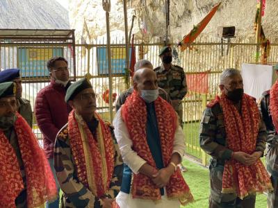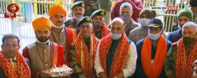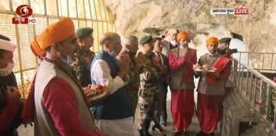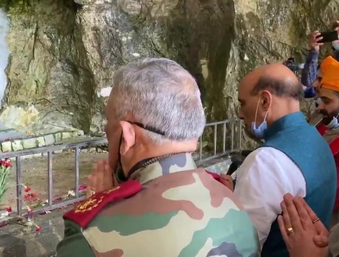जम्मू-कश्मीर में रक्षा मंत्री राजनाथ सिंह, चीफ ऑफ डिफेंस स्टाफ जनरल बिपिन रावत और सेना प्रमुख जनरल एमएम नरवणे ने अमरनाथ मंदिर में पूजा की।