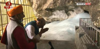 रक्षा मंत्री राजनाथ सिंह ने शनिवार को अमरनाथ की पवित्र गुफा के दर्शन किए और वहां पूजा अर्चना की। सिंह ने मंदिर परिसर में करीब एक घंटा बिताया।