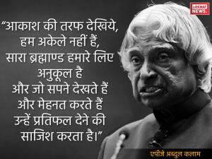 1 / 10“आकाश की तरफ देखिये, हम अकेले नहीं हैं, सारा ब्रह्माण्ड हमारे लिए अनुकूल है और जो सपने देखते हैं और मेहनत करते हैं उन्हें प्रतिफल देने की साजिश करता है।”2 / 10“इंसान को कठिनाइयों की आवश्यकता होती है, क्योंकि सफलता का आनंद उठाने कि लिए ये ज़रूरी हैं।”3 / 10“एक अच्छी पुस्तक हज़ार दोस्तों के बराबर होती है जबकि एक अच्छा दोस्त एक लाइब्रेरी (पुस्तकालय) के बराबर होता है”4 / 10आप अपना भविष्य नहीं बदल सकते पर आप अपनी आदते बदल सकते है और निश्चित रूप से आपकी आदते आपका भविष्य बदल देगी।”5 / 10ज़िंदगी में लक्ष्य तय करना, ज्ञान को प्राप्त करना, कठिन मेहनत करना, अपने लक्ष्य के प्रति दृढ़ रहना” ये हर युवाओं के लिए पाथेय है।6 / 10अगर तुम सूरज की तरह चमकना चाहते हो तो पहले सूरज की तरह जलो।7 / 10सपने वो नहीं है जो आप नींद में देखे, सपने वो है जो आपको नींद ही नहीं आने दे।8 / 10छोटा लक्ष्य अपराध हैं; महान लक्ष्य होना चाहिये।9 / 10“एक मूर्ख जीनियस बन सकता है यदि वो समझता है की वो मूर्ख है लेकिन एक जीनियस मूर्ख बन सकता है यदि वो समझता है की वो जीनियस है।”10 / 10अगर आप वक्त की रेत पर अपने कदमों के निशान छोड़ना चाहते हैं तो पैर घसीट कर मत चलिए।