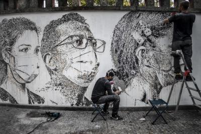 पुर्तगाली कलाकार एलेक्जेंडर फार्टो उर्फ विल्स के सहायक ने पोर्टो में साओ जोआओ अस्पताल की दीवार पर श्रमिकों के चेहरे का चित्रण किया।