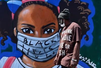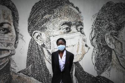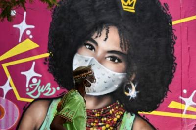 कोलंबिया में कोरोना वायरस के प्रसार के खिलाफ व्यक्ति बचने के लिए फेस मास्क पहना है, वही, पीछे एक दीवार पर भी मास्क पहनी हुई पेंटिंग बनी है।