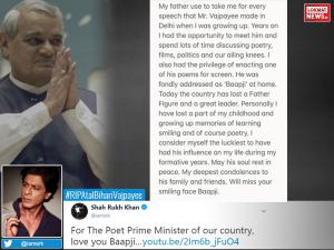 1 / 9बॉलीवुड एक्टर शाहरुख खान ने अटल जी के लिए बेहद भावुक मैसेज लिखकर उन्हें श्रद्धांजलि दी है। 2 / 9बॉलीवुड एक्टर जॉन अब्राहम ने भी अटल को महान नेता बताया है।3 / 9अनिल कपूर ने भी अटल जी के लिखा है, 'उन्होंने अपने बचपन के आइडल को खो दिया है4 / 9अमिताभ बच्चन ने भी अटल जी को श्रद्धांजलि दी है।5 / 9अनुपम खेर ने भी अटल जी को श्रद्धांजलि दी है।6 / 9ऋतिक रोशन ने भी अटल जी को श्रद्धांजलि दी है।7 / 9सोनाक्षी सिन्हा ने भी इस दुखद मौके पर अटल जी को श्रद्धांजलि दी है।8 / 9शत्रुघन सिन्हा ने भी सोशल मीडिया पर अटल बिहारी वाजपेयी को श्रद्धांजलि दी है।9 / 9रितेश देशमुख ने अटल जी के निधन पर शोक जताते हुए, उन्हें श्रद्धांजलि दी है।