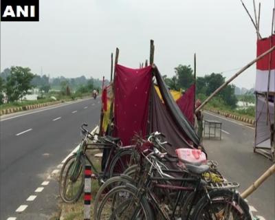 बिहार के मुजफ्फरपुर में बाढ़ की वजह से लोग NH27 के किनारे पर रहने के लिए मजबूर। गांव कोल्हुआ, पैगंबरपुर निवासी एक बाढ़ पीड़िता ने बताया, "सड़क के किनारे रह रहे हैं। सरकार की तरफ से कभी रात को 2बजे तो कभी दिन में 2बजे खाना मिलता है। सरकार ने एक पॉलीथीन तक नहीं दिया है।"