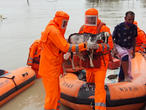 1 / 12असम और बिहार में बाढ़ के हालात अधिक गंभीर हो गए व बाढ़ के कारण पांच और लोगों की मौत हो गई। इन दो राज्यों में बाढ़ से करीब 40 लाख लोग प्रभावित हैं। असम राज्य आपदा प्रबंधन प्राधिकरण ने अपनी बाढ़ संबंधी नियमित रिपोर्ट में बताया कि राज्य में पांच और लोगों की मौत बाढ़ के कारण हो गई है जिसके कारण 102 लोगों की मौत बाढ़ से जुड़ी घटनाओं में हो चुकी है तथा 26 लोगों की मौत भूस्खलन के कारण हुई।2 / 12बिहार के मुजफ्फरपुर में बाढ़ की वजह से लोग NH27 के किनारे पर रहने के लिए मजबूर। गांव कोल्हुआ, पैगंबरपुर निवासी एक बाढ़ पीड़िता ने बताया, 'सड़क के किनारे रह रहे हैं। सरकार की तरफ से कभी रात को 2बजे तो कभी दिन में 2बजे खाना मिलता है। सरकार ने एक पॉलीथीन तक नहीं दिया है।'3 / 12बिहार के 12 जिलों की 1495132 आबादी बाढ़ से प्रभावित है और 136464 लोगों को सुरक्षित स्थानों तक पहुंचाया गया है। वहां निकाले गए 136464 लोग 14011 राहत शिविरों में शरण लिए हुए हैं।4 / 12आपदा प्रबंधन विभाग से प्राप्त जानकारी के मुताबिक प्रदेश के 12 जिलों सीतामढ़ी, शिवहर, सुपौल, किशनगंज, दरभंगा, मुजफ्फरपुर, गोपालगंज, पूर्वी चम्पारण, पश्चिम चंपारण, खगड़िया एवं सारण जिले के 86 प्रखंडों के 625 पंचायतों की 1495132 आबादी बाढ़ से प्रभावित है। 5 / 12दरभंगा जिले में सबसे अधिक 12 प्रखंडों के 131 पंचायतों की 536846 आबादी बाढ़ से प्रभावित हुई है। उसके हनुमाननगर प्रखंड के विशुनपुर गांव में बाढ़ का पानी प्रवेश कर जाने से लोग घुटने से लेकर कमर तक पानी में रहने को विवश हैं। 6 / 12बिहार के पूर्वी चंपारण में एनडीआरएफ के जवान लोगों के लिए देवदूत बनकर सामने आए। पूर्वी चंपारण जिले में पानी की लहरों में फंसे लोग एक नाव से नदी पार कर रहे थे, लेकिन इनकी नाव जब नदी में फंस गई तो एनडीआरएफ की टीम ने नाव को खींच कर किनारे लगाया।7 / 12बिहार और असम में बाढ़ की स्थिति भयावह बनी हुई है. बिहार के 12 जिलों की आबादी भीषण बाढ़ का सामना कर रही है। राज्य में गांव बाढ़ में डूबे हैं।8 / 12गोपालगंज में डुमरिया पुल के पास तटबंध टूटने से बड़े इलाके में बाढ़ का पानी भर गया है, जिससे दिल्ली को जोड़ने वाले नेशनल हाइवे 28 को भी खतरा पैदा हो गया है। पूर्वी चंपारण को गोपालगंज से जोड़ने वाले डुमरिया पुल को प्रशासन ने बंद कर दिया है।9 / 12मब्बी गांव सहित उसके आसपास के सात—आठ गांव में बाढ़ का पानी प्रवेश कर जाने से वहां के लोग राष्ट्रीय राजमार्ग संख्या 57 पर शरण लिए हुए हैं । बिहार के बाढ़ प्रभावित इन जिलों में बचाव और राहत कार्य चलाए जाने के लिए एनडीआरएफ और एसडीआरएफ की कुल 25 टीमों की तैनाती की गयी है।10 / 12एनडीआरएफ की 9वीं बटालियन के कमांडेंट विजय सिन्हा ने बताया कि बाढ़ प्रभावित पूर्वी चंपारण जिले के बंजरिया प्रखंड अंतर्गत गोबरी गाँव में एनडीआरएफ की एक बचाव नौक