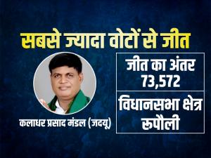 1 / 6रूपौली विधानसभा सीट जनता दल (यूनाइटेड) के कलाधर प्रसाद मंडल 73,572 वोटों के अंतर से जीते।2 / 6दीघा सीट से बीजेपी उम्मीदवार संजीव चौरसिया 59,079 वोटों के अंतर से जीते।3 / 6गोपालपुर सीट से जदयू के उम्मीदवार शैलेश कुमार उर्फ बुलो मंडल 58,135 वोटों के अंतर से जीते।4 / 6संदेश विधानसभा क्षेत्र से जनता दल यूनाइटेड के उम्मीदवार राधा चरण साह सबसे कम 27 वोटों के अंतर से जीते।5 / 6बहुजन समाज पार्टी के सतीश कुमार सिंह यादव ने रामगढ़ सीट पर 30 वोटों के अंतर से जीते।6 / 6बीजेपी के उम्मीदवार महेश पासवान अगिआंव सीट पर 95 वोटों के अंतर से जीते।