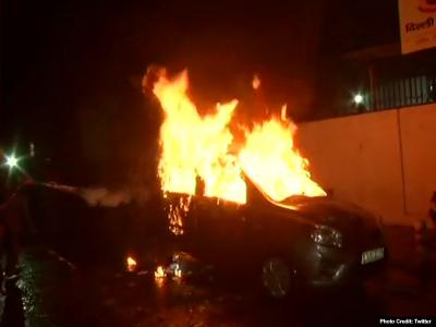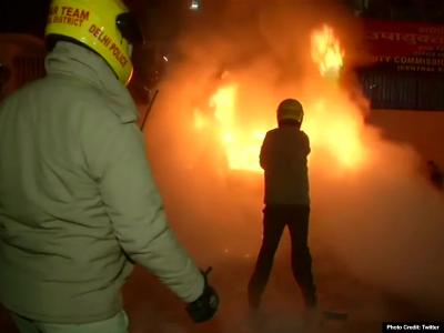 दिल्ली के दरियागंज इलाके में प्रदर्शनकारियों ने गाड़ी को लगाईं आग।