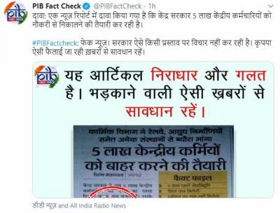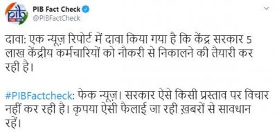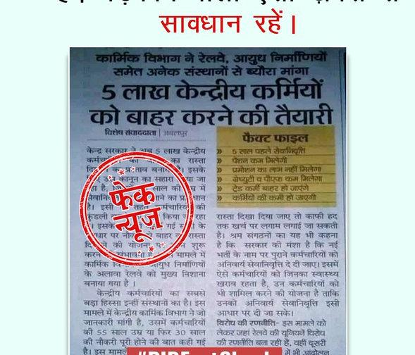 कोरोना वायरस के बढ़ते मामलों के बीच देश में फेक न्यूज भी काफी वायरल हो रही हैं। ऐसे में एक नया मैसेज सोशल मीडिया पर वायरल हो रहा है, जिसमें ये दावा किया गया है कि केंद्र सरकार 5 लाख केंद्रीय कर्मचारियों को नौकरी से निकालने की तैयारी कर रही है। (फोटो सोर्स- ट्विटर)