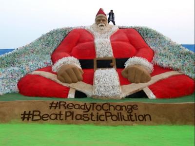 अमीर-गरीब से अलग कलाकार सुदर्शन पटनायक ने क्रिसमस में प्लास्टिक प्रदूषण के प्रति जागरूकता पैदा करने के लिए ये विशेष कलाकृति बनायी। (सभी तस्वीरें- एएफपी)