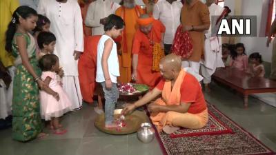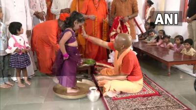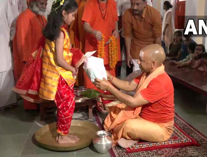 उत्तर प्रदेश के मुख्यमंत्री योगी आदित्यनाथ ने नवमी के पावन अवसर पर गोरखपुर के गोरखनाथ मंदिर में कन्या पूजन किया। (फोटो: Twitter/ANI)