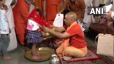 इस दौरान सीएम योगी ने कन्यायों के पैर धोये उनके माथे पर रोली, चंदन, दही, अक्षत का तिलक लगाकर विधि विधान से पूजन किया। (फोटो: Twitter/ANI)