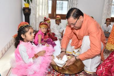 उत्तराखंड के मुख्यमंत्री पुष्कर सिंह धामी ने भी देहरादून में नवमी के अवसर पर 'कन्या पूजन' किया। (फोटो: Twitter/ANI)