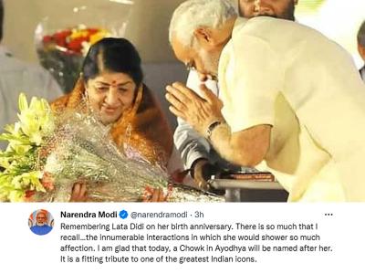 मंगेशकर की 93वीं जयंती पर पीएम मोदी ने ट्वीट कर लिखा, "लता दीदी की जयंती पर आज उन्हें याद कर रहा हूं। याद करने को बहुत कुछ है...कई ऐसे संवाद हैं जिनमें उन्होंने मुझ पर अपना प्यार बरसाया। मुझे खुशी है कि आज उनकी स्मृति में अयोध्या में एक चौक का नामकरण किया जाएगा। देश की महान हस्तियों में एक लता दीदी को यह उचित श्रद्धांजलि होगी।" (फोटो: Twitter)