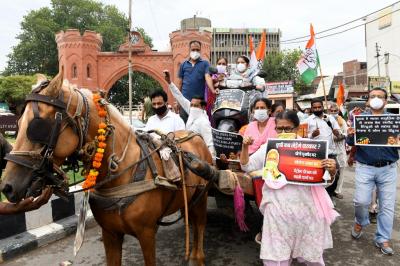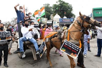 कांग्रेस की युवा इकाई के नेताओं एवं कार्यकर्ताओं ने पेट्रोल-डीजल की कीमतों में हो रही बढ़ोतरी के खिलाफ सोमवार को बैलगाड़ी पर बैठकर जुलूस निकाला।