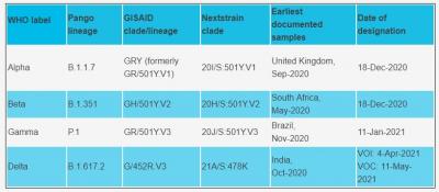 WHO कोरोना के उन वेरिएंट्स के लिए लेबल असाइन करेगा जिन्हें वैरिएंट ऑफ़ इंटरेस्ट या वेरिएंट ऑफ़ कंसर्न के रूप में नामित किया गया है। अक्टूबर 2020 में भारत में लॉन्च किए गए कोरोना वेरिएंट B.1.617.2 G/452R.V3, का भी नाम रखा गया है। इस वेरिएंट को डेल्टा नाम दिया गया है। भारत में पाए जाने वाले वायरस के एक अन्य प्रकार (बी.1.617.1) को कप्पा कहा जाता है।