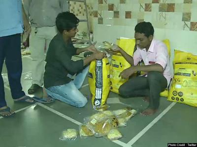 चक्रवाती तूफान 'वायु' से प्रभावित लोगों के लिए राजकोट में लोग फूड पैकेट तैयार करते हुए