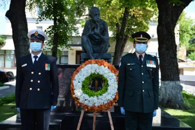 सिंह ने ट्वीट किया, ‘‘मास्को में आज भारतीय दूतावास का दौरा किया और महात्मा गांधी को उनकी प्रतिमा पर माल्यार्पण कर विनम्र श्रद्धांजलि दी।’’ ट्वीट के साथ जारी तस्वीरों में सिंह फेस मास्क पहने और महात्मा गांधी की प्रतिमा पर माल्यार्पण करते दिख रहे हैं।