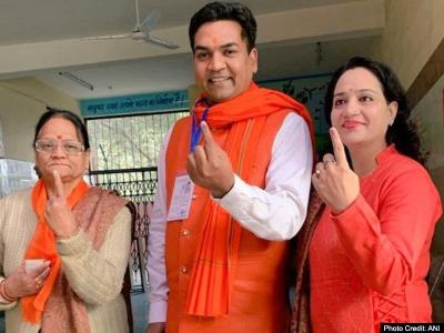 बीजेपी के मॉडल टाउन से उम्मीदवार कपिल मिश्रा अपने परिवार के साथ वोट डालने पोलिंग बूथ पहुंचे।