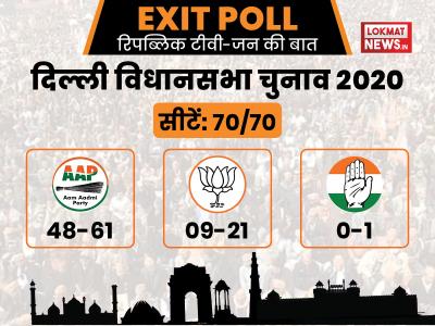 रिपब्लिक टीवी-जन की बात के एग्जिट पोल के मुताबिक, दिल्ली में AAP को 48-61, बीजेपी को 9 से 21 और कांग्रेस को 0-1 सीटें मिलने का अनुमान है।