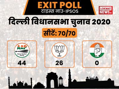टाइम्स नाउ Ipsos एग्जिट पोल के मुताबिक दिल्ली में AAP को 44 सीटें मिल रही हैं। वहीं बीजेपी को 26 सीट जीतेने का अनुमान है। वहीं कांग्रेस को जीरो सीट मिलते दिख रही है।