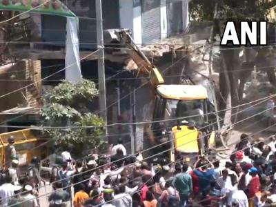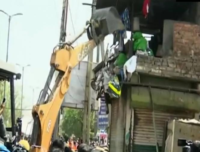 जहांगीरपुरी में हुई हिंसा के बाद एमसीडी की ओर से इलाके में अवैध निर्माण और अतिक्रमण के खिलाफ बुलडोजर चलाया गया जिस पर सुप्रीम कोर्ट ने रोक लगा दी है। (फोटो: Twitter/ANI)