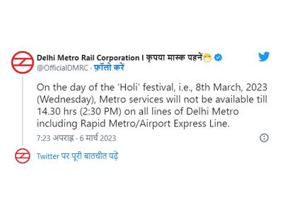 डीएमआरसी ने अपने ट्विटर अकाउंट पर जानकारी दी कि “होली के त्योहार के दिन यानी आठ मार्च, 2023 को रैपिड मेट्रो/एयरपोर्ट एक्सप्रेस लाइन सहित दिल्ली मेट्रो की सभी लाइनों पर दोपहर 2:30 बजे तक मेट्रो सेवाएं उपलब्ध नहीं रहेंगी।”
