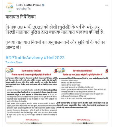 दिल्ली ट्रैफिक पुलिस ने कहा है, "8 मार्च को होली के पर्व के मद्देनजर दिल्ली ट्रैफिक पुलिस की ओर से व्यापक यातायात व्यवस्था की गई है। कृपया ट्रैफिक नियमों का अनुपालन करें और खुशियों के पर्व का आनंद लें।"