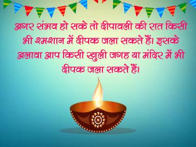 अगर संभव हो सके तो दीपावली की रात किसी भी श्मशान में दीपक जला सकते हैं। इसके अलावा आप किसी खुली जगह या मंदिर में भी दीपक जला सकते हैं।