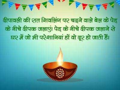 दीपावली की रात शिवलिंग पर चढ़ने वाले बेल के पेड़ के नीचे दीपक जलाएं। पेड़ के नीचे दीपक जलाने से घर में जो भी परेशानियाँ हों वो दूर हो जाती हैं।