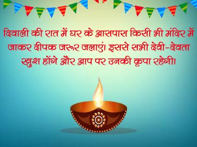 दिवाली की रात में घर के आसपास किसी भी मंदिर में जाकर दीपक जरूर जलाएं। इससे सभी देवी-देवता खुश होंगे और आप पर उनकी कृपा रहेगी।
