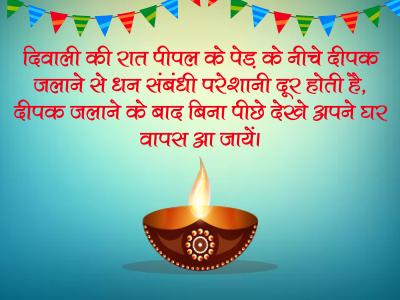 दिवाली की रात पीपल के पेड़ के नीचे दीपक जलाने से धन संबंधी परेशानी दूर होती है, दीपक जलाने के बाद बिना पीछे देखे अपने घर वापस आ जायें।
