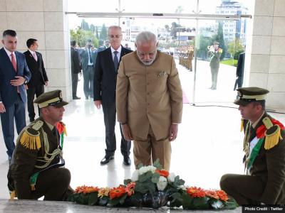 रामल्लाह में पीएम मोदी ने सबसे पहले दिवंगत फिलीस्तीनी नेता यासिर अराफात की समाधि पर जाकर उन्हें श्रद्धांजलि दी