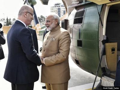 जॉर्डन के अम्मान से हेलीकाप्टर से रामल्लाह पहुंचने पर फिलिस्तीन के प्रधानमंत्री रामी हमदल्लाह ने मोदी की यहां अगवानी की।