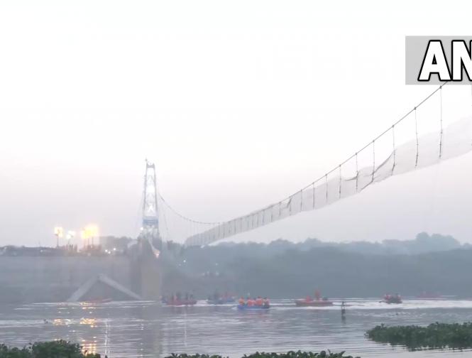 रविवार गुजरात के मोरबी में माच्छू नदी पर बना केबल पुल टूट गया जिसमें 141 से ज्यादा लोगों की मौत हो गई। (फोटो: Twitter/ANI)