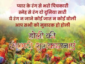1 / 8प्यार के रंग से भरो पिचकारी स्नेह से रंग दो दुनिया सारी ये रंग न जाने कोई जात न कोई बोली आप सभी को मुबारक हो होली।2 / 8पिचकारी की धार, गुलाल की बौछार, अपनों का प्यार, यही है यारों होली का त्यौहार।3 / 8पूर्णिमा का चांद, रंगों की डोली चांद से उसकी, चांदनी बोली खुशियों से भरे, आपकी झोली मुबारक हो आपको, रंग-बिरंगी होली4 / 8रंगो से भरा रहे जीवन तुम्हारा, खुशियां बरसे तुम्हारे आंगन, इंद्रधनुष सी खुशियां आएं आओ मिलकर होली मनाएं।5 / 8दिलों को मिलाने का मौसम है दूरियां मिटाने का मौसम है, होली का त्यौहार ही ऐसा है, रंगों में डूब जाने का मौसम है।6 / 8खा के गुजिया, पी के भंग लगा के थोड़ा-थोड़ा सा रंग बजा के ढोलक और मृदंग आओ खेले होली हम एक-दूजे संग7 / 8खुशी के इस पल में ये दिल बस मुस्कुराए, हर गम भुला के प्यार भरे सपने सजाए इन हसीन पलों की खुशबू इस दिल को बहुत भाए, शायद इन पलों का संगम ही जन्नत कहलाए हैप्पी होली8 / 8हमेशा मीठी रहे आपकी बोली, खुशियों से भर जाए आपकी झोली, आप सबको मेरी तरफ से हैप्पी होली