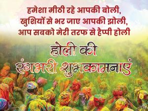 1 / 7हमेशा मीठी रहे आपकी बोली, खुशियों से भर जाए आपकी झोली, आप सबको मेरी तरफ से हैप्पी होली2 / 7खा के गुजिया, पी के भंग लगा के थोड़ा-थोड़ा सा रंग बजा के ढोलक और मृदंग आओ खेले होली हम एक-दूजे संग3 / 7दिलों को मिलाने का मौसम है दूरियां मिटाने का मौसम है, होली का त्यौहार ही ऐसा है, रंगों में डूब जाने का मौसम है।4 / 7रंगो से भरा रहे जीवन तुम्हारा, खुशियां बरसे तुम्हारे आंगन, इंद्रधनुष सी खुशियां आएं आओ मिलकर होली मनाएं।5 / 7पूर्णिमा का चांद, रंगों की डोली चांद से उसकी, चांदनी बोली खुशियों से भरे, आपकी झोली मुबारक हो आपको, रंग-बिरंगी होली6 / 7पिचकारी की धार, गुलाल की बौछार, अपनों का प्यार, यही है यारों होली का त्यौहार।7 / 7प्यार के रंग से भरो पिचकारी स्नेह से रंग दो दुनिया सारी ये रंग न जाने कोई जात न कोई बोली आप सभी को मुबारक हो होली।