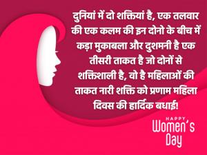 1 / 7दुनियां में दो शक्तियां है, एक तलवार की एक कलम की इन दोनो के बीच में कड़ा मुकाबला और दुश्मनी है एक तीसरी ताकत है जो दोनों से शक्तिशाली है, वो है महिलाओं की ताकत नारी शक्ति को प्रणाम महिला दिवस की हार्दिक बधाई!2 / 7दिन की रोशनी ख्वाबों को बनाने मे गुजर गई, रात की नींद बच्चे को सुलाने मे गुजर गई, जिस घर मे मेरे नाम की तखती भी नहीं, सारी उमर उस घर को सजाने मे गुजर गई। महिला दिवस की हार्दिक बधाई!3 / 7जिसने बस त्याग ही त्याग किए जो बस दूसरों के लिए जिए फिर क्यों उसको धिक्कार दो उसे जीने का अधिकार दो महिला दिवस की हार्दिक बधाई!4 / 7औरत का इस दुनिया में मान है औरत एक बहन है एक बेटी है, एक पत्नी है औरत के बिना यह जहां कुछ भी नहीं है महिला दिवस की हार्दिक बधाई!5 / 7औरत संसार की किस्मत है फिर भी किस्मत की मारी है औरत आज भी जिन्दा जलती है फिर भी कहलाती वो कुर्बानी है6 / 7जिसने बस त्याग ही त्याग किए जो बस दूसरों के लिए जिए फिर क्यों उसको धिक्कार दो उसे जीने का अधिकार दो महिला दिवस की शुभकामनाएं7 / 7नारी सशक्तिकरण का क्या अर्थ हैं, यदि नारी का सम्मान नहीं कर सके तो सब व्यर्थ हैं.