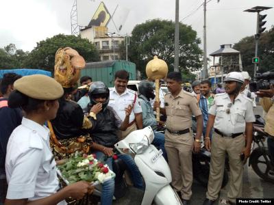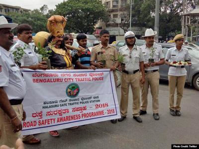 बेंगलुरु की सड़कों पर लोगों को ट्रैफिक के नियमों के बारे में समझाते हुए नजर आ रहे हैं।