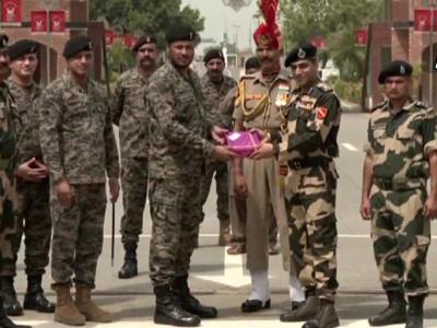 पंजाब से भी तस्वीरें आईं। अटारी-वाघा बॉर्डर पर सिक्यूरिटी फोर्स (बीएसएफ) और पाकिस्तानी रैंजर्स ने एक-दूसरे को मिठाई दी।