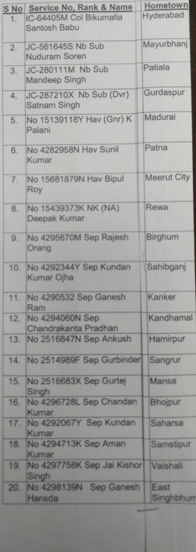 तेलंगाना के वीर सपूत कर्नल बिकुमल्ला संतोष बाबू को राष्ट्र की सेवा में सर्वोच्च बलिदान देने के लिए भारतीय सेना ने श्रद्धांजलि अर्पित की। सेना की दक्षिण कमान के प्रमुख और सभी रैंक की ओर से लेफ्टिनेंट जनरल टीसीए नारायणन ने शहीद के पार्थिव शरीर पर पुष्प चक्र अर्पित किया।